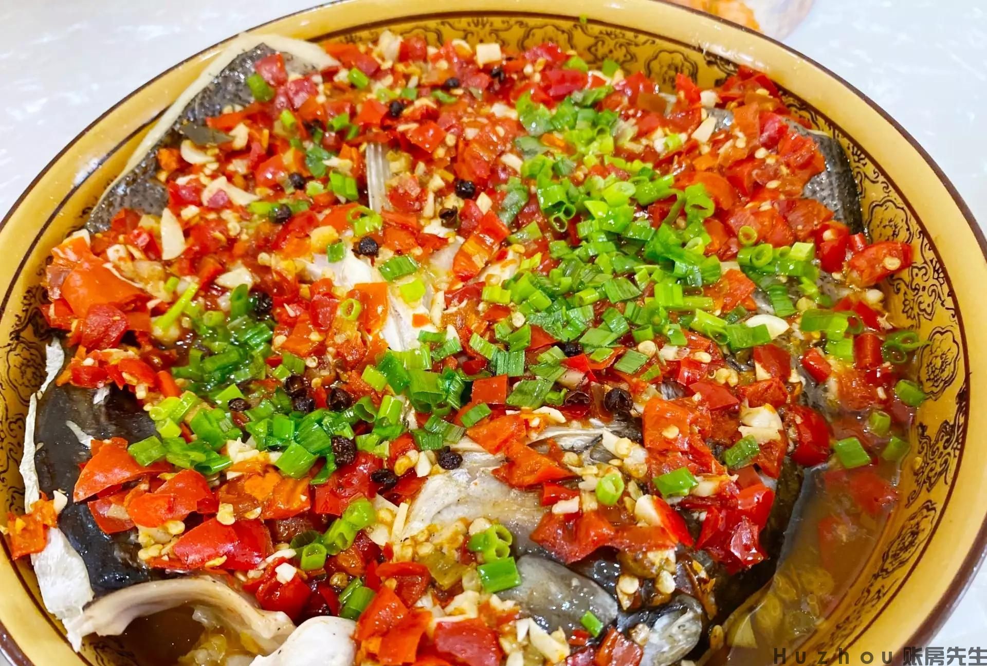 准备一只盘子,底部铺上几片生姜,再放入鱼头,然后把炒好的剁辣椒平铺在鱼头上。