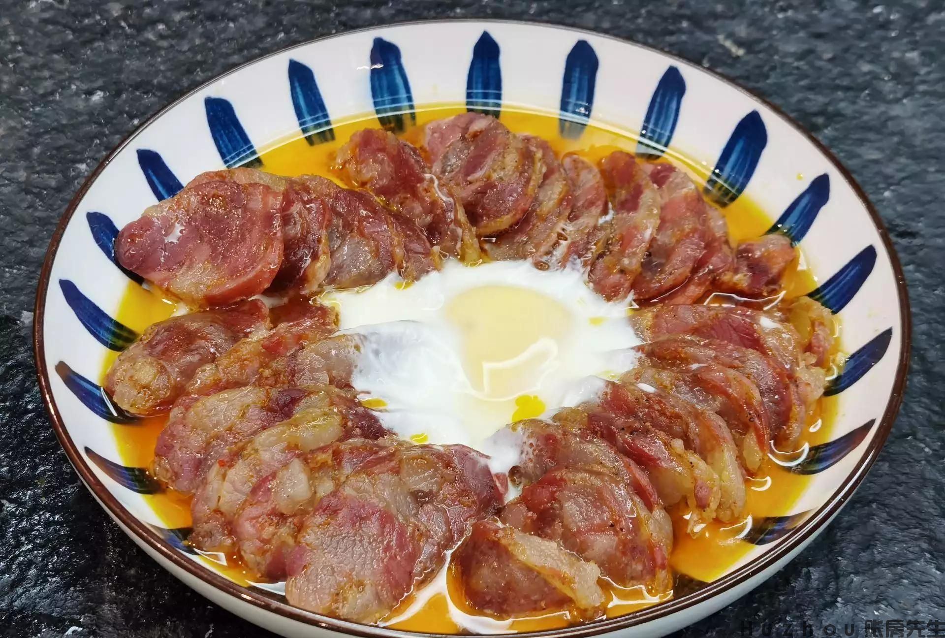 取出腊肠,把它切成片摆在盘子四周,打一个鸡蛋放在碗中间。