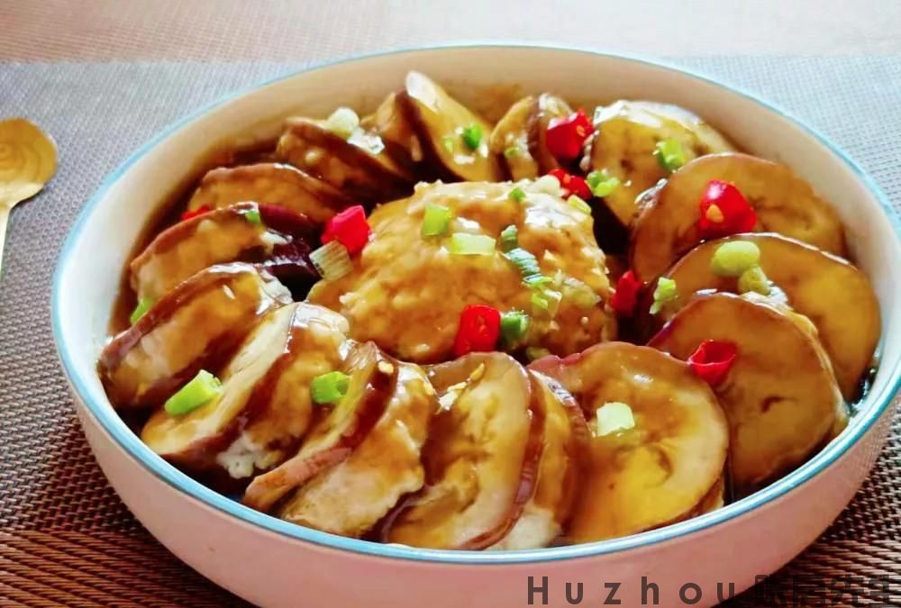 把猪肉香菇馅放入茄子中,摆在盘子里。